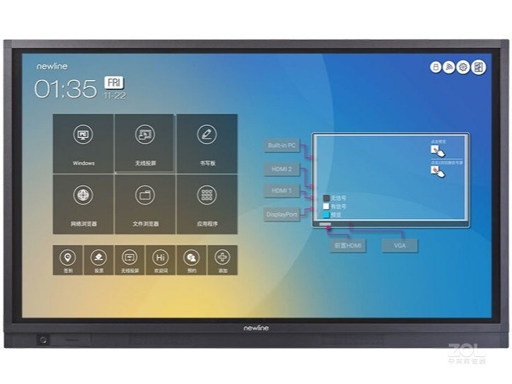 newline TT-6519RS智能会议平板机身没有太多华丽炫酷的外表,更多的是一份简洁与大气,能够适配与各种会议室环境。前面板为纯黑配色,同时窄边框的设计让画面显示面积更大,参会者在观看时能够拥更好的观看体验。
